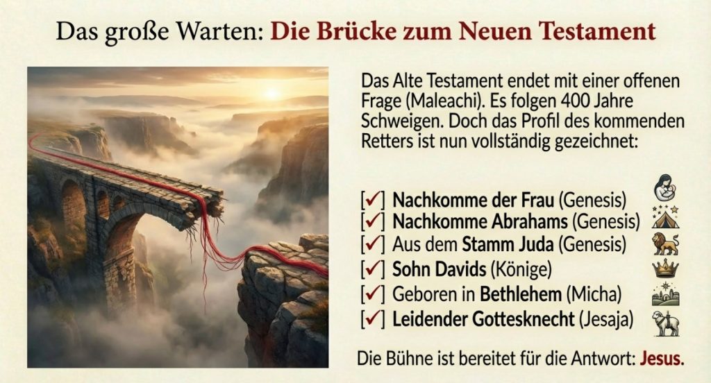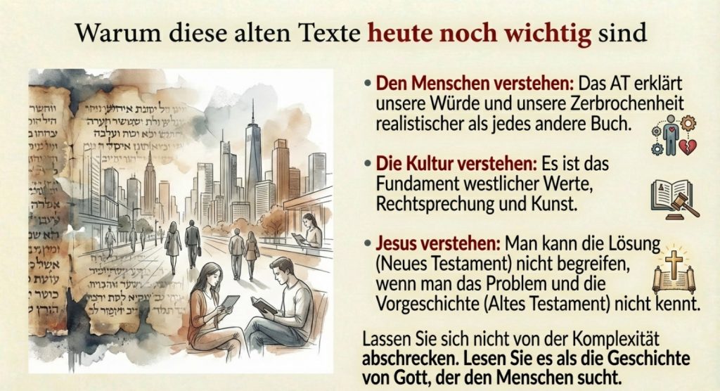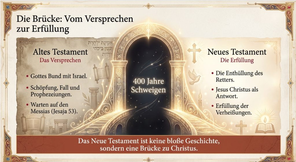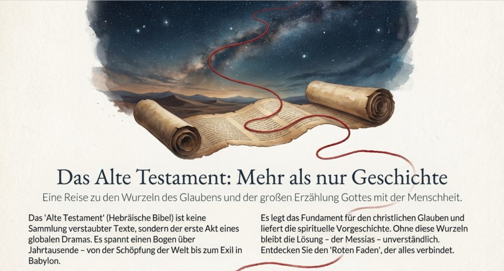 Thematisch dreht sich alles um Gottes Bund mit seinem Volk Israel – ein Versprechen der Erlösung, das im Neuen Testament in Jesus Christus erfüllt wird. Für das Verständnis über den Weg zu Jesus Christus ist das Alte Testament essenziell, da es die Vorgeschichte, die Prophezeiungen und die spirituellen Grundlagen liefert, die auf den Messias hindeuten.