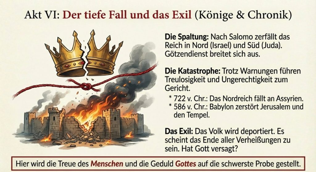 Salomo erbaut Tempel (1. Kön 1–8), weist Weisheit (1. Kön 3). Reichtum, aber Götzendienst (1. Kön 11). Reich spaltet: Rehabeam Süd (Juda), Jerobeam Nord (Israel), Goldene Kälber.