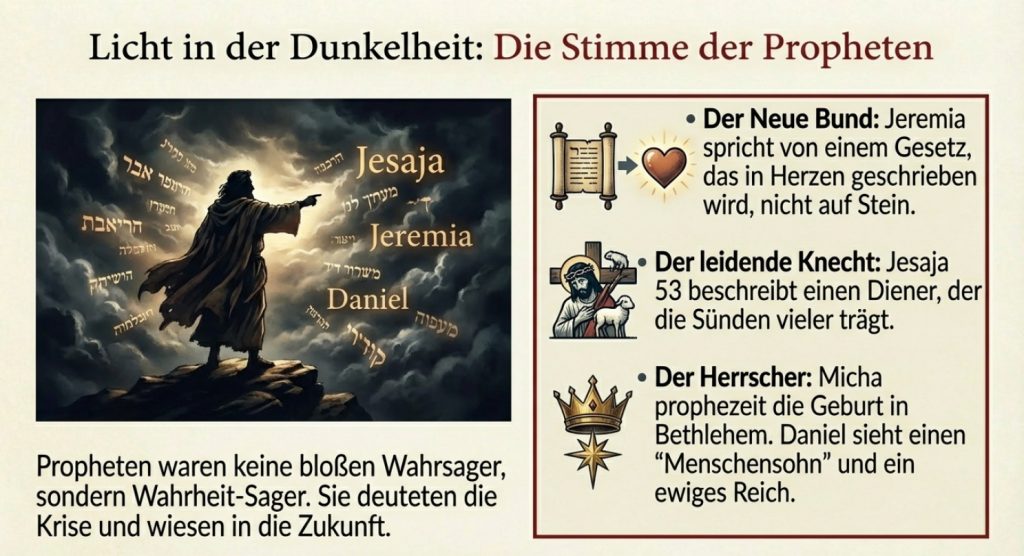 Jesaja (Jes 1–39): Gericht über Juda, Assyrer. Jes 40–66: Trost, Babylonsfall. Jungfrauengeburt (Jes 7,14), Immanuel. Leidender Knecht (Jes 53): Erfüllt in Jesus Kreuz.
