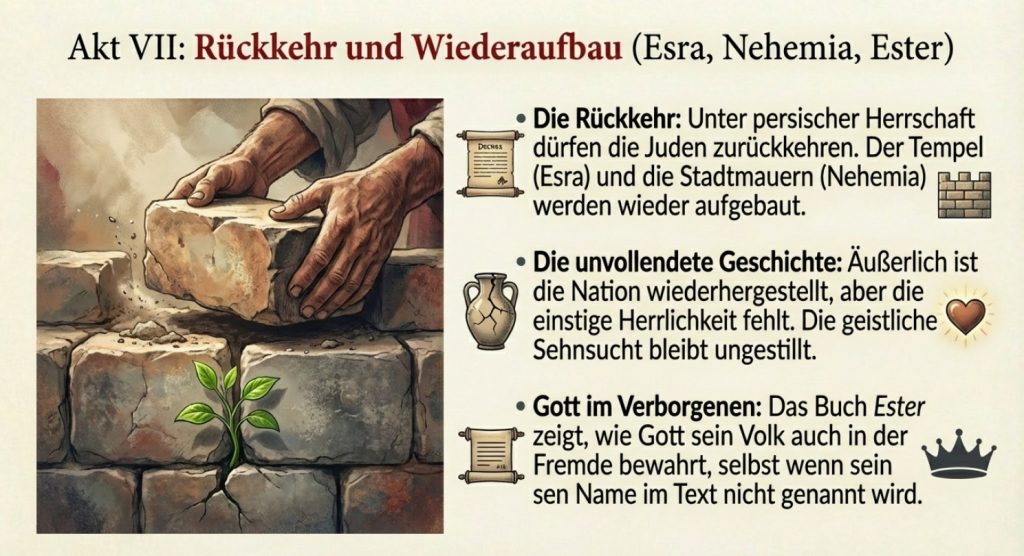 Unter Kyros (538 v. Chr.) kehren Juden zurück (Esra 1–6). Serubbabel baut Altar, Tempel (trotz Opposition). Esra, Schriftgelehrter, kommt 458 v. Chr. (Esra 7–10), lehrt Gesetz, bekämpft Mischehen.
