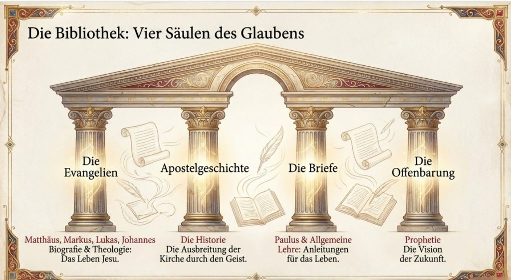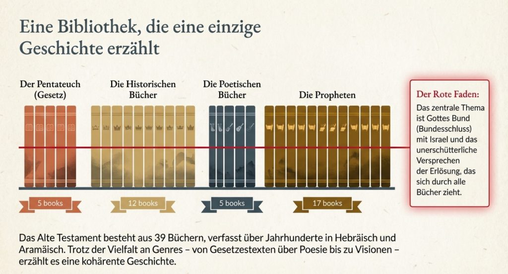 Das Alte Testament gliedert sich in vier Hauptabschnitte: den Pentateuch (die fünf Bücher Mose), die historischen Bücher, die poetischen oder Weisheitsbücher und die Prophetenbücher. Diese Struktur hilft, die narrative und theologische Entwicklung zu verstehen. Die Texte wurden größtenteils auf Hebräisch verfasst, mit einigen aramäischen Teilen, und spiegeln eine reiche Vielfalt an Genres wider: Erzählungen, Gesetze, Lieder, Weisheitssprüche und prophetische Visionen.