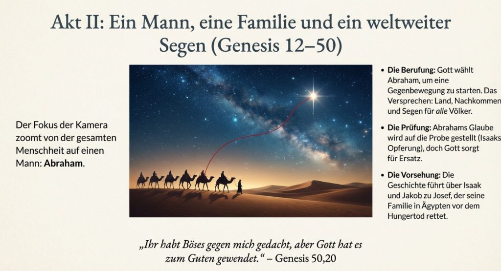 Der Fokus verschiebt sich zu den Patriarchen: Abraham (ursprünglich Abram) wird in Gen 12 berufen, Haran zu verlassen und ins verheißene Land Kanaan zu gehen. Gott verspricht Nachkommen wie Sterne am Himmel, Land und Segen für alle Völker (Gen 12,1–3) – eine zentrale Verheißung, die in Christus erfüllt wird. Abraham gehorcht, doch Prüfungen folgen: Hungersnot in Ägypten, wo er Sara als Schwester ausgibt; der Bundesschnitt (Gen 15), bei dem Gott einseitig schwört; die Geburt Ismaels durch Hagar, die Sklavin (Gen 16), was Spannungen schafft. Der Höhepunkt ist die Beschneidung als Bundeszeichen (Gen 17) und der fastige Opfergang Isaaks (Gen 22), der Abrahams Glauben testet und Gottes Versorgung zeigt (der Widder im Busch).