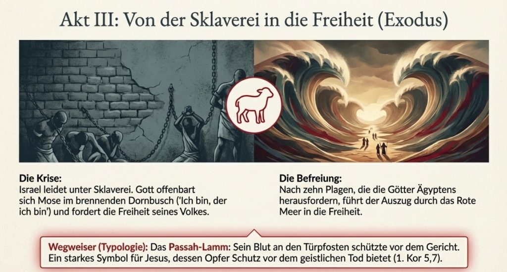 Exodus, das „Ausziehungsbuches“, fährt mit der Unterdrückung der Israeliten in Ägypten fort (Ex 1). Pharao fürchtet ihr Wachstum und tötet hebräische Jungen. Mose, im Nil gerettet, flieht nach einem Mord nach Midian, wo er Zippora heiratet und Gott am brennenden Dornbusch begegnet (Ex 3). Gott offenbart sich als „Ich bin, der ich bin“ und ruft Mose zur Befreiung. Mit Aaron als Sprecher und Wundern (Stab zur Schlange) konfrontiert Mose Pharao. Die zehn Plagen (Blut, Frösche, Stechmücken usw. bis Finsternis und Tod der Erstgeborenen) zwingen Pharao zum Nachgeben (Ex 7–12). Das Passah-Lamm, dessen Blut schützt, ist ein Typus für Christus als Passalamm (1. Kor 5,7).