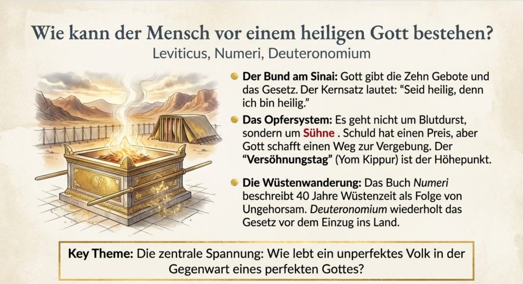 Themen: Ungehorsam und Gnade, Vorbereitung auf Erbe. Numeri zeigt Gottes Treue trotz menschlicher Schwäche, wie Jesus uns trägt.