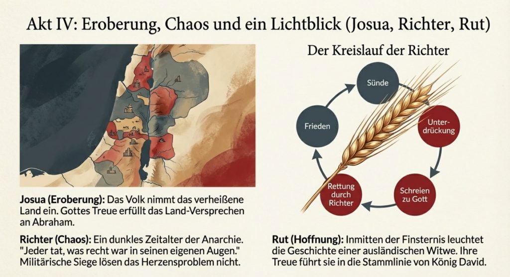 Josua, Moses Nachfolger, führt Israel über den Jordan (Jos 1–5). Jericho fällt durch Marsch und Posaunen (Jos 6). Achan-Sünde (Jos 7) verursacht Niederlage bei Ai, doch Ai wird erobert (Jos 8). Bundserneuerung am Ebal (Jos 8). Gibeoniter-Bündnis (Jos 9). Süd- und Nordfeldzüge (Jos 10–11). Landteilung (Jos 13–21): Stämme erhalten Erbteile, Leviten Städte.
