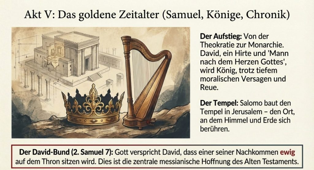 David wird König in Hebron (2. Sam 2–5), erobert Jerusalem. Bunds-Arche nach Zion (2. Sam 6). Nathans Weissagung (2. Sam 7): Ewiger Thron für Davids Haus – messianisch erfüllt in Jesus.