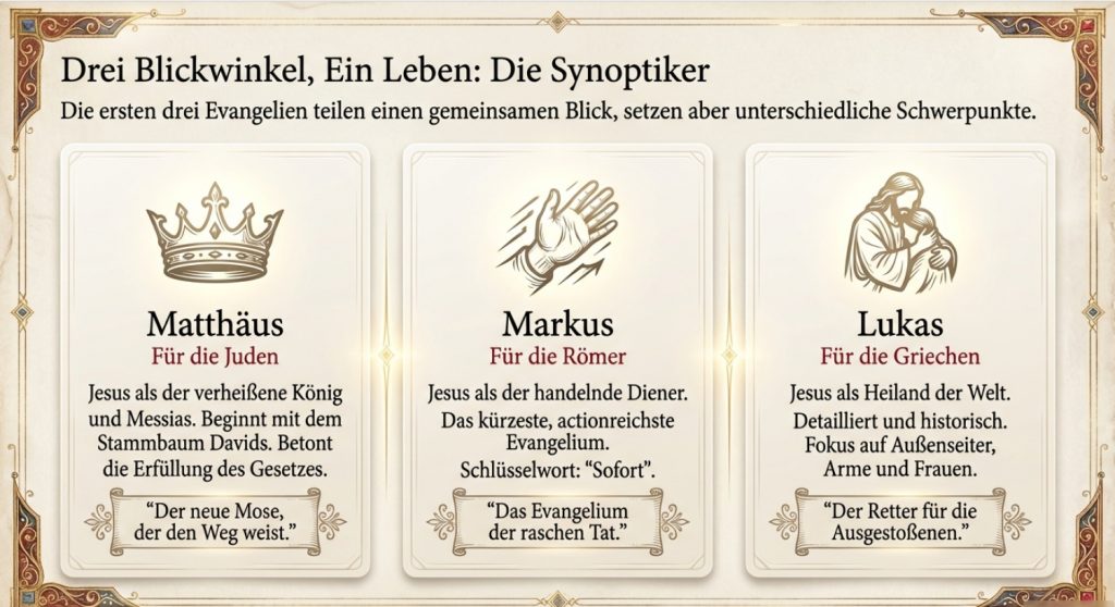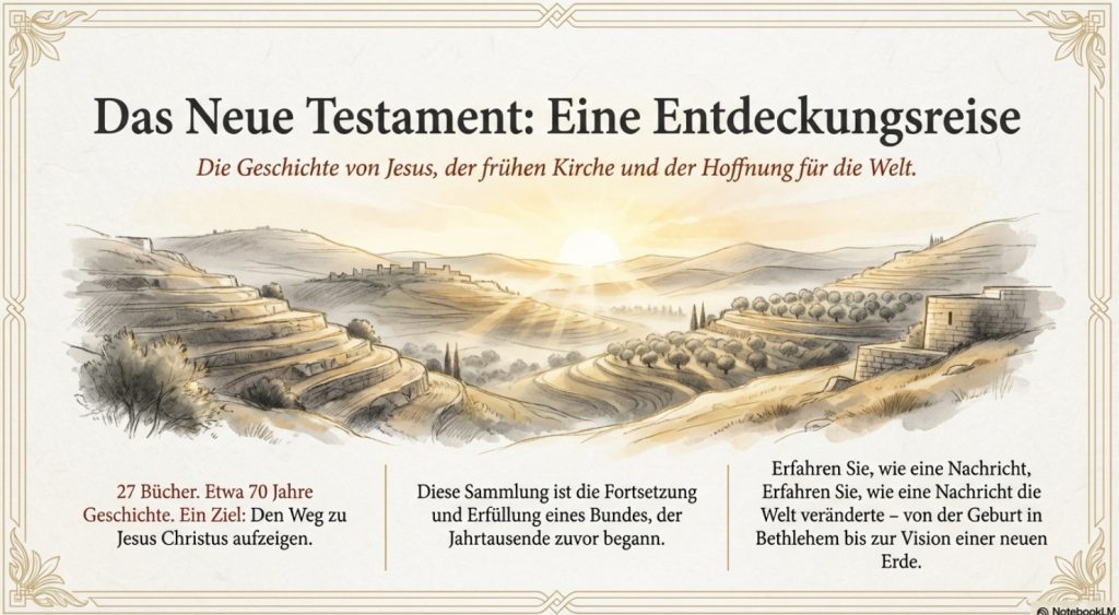 Das Neue Testament ist der lebendige Wegweiser zu Jesus Christus: Von seiner Geburt bis zur ewigen Herrlichkeit lädt es ein, ihm nachzufolgen. Es verbindet alttestamentliche Verheißungen mit der Realität der Kirche und der Hoffnung auf seine Wiederkunft. Für deinen Kurs: Strukturiere Module um Evangelien (Wer ist Jesus?), Apostelgeschichte/Briefe (Wie lebt man als Jünger?) und Offenbarung (Wo geht’s hin?). Ermutige zu Gebet, Bibellesen und Gemeinschaft – der Heilige Geist führt weiter. Möge diese Zusammenfassung den Kurs Den Weg zu Jesus finden bereichern und Seelen zu Christus führen.