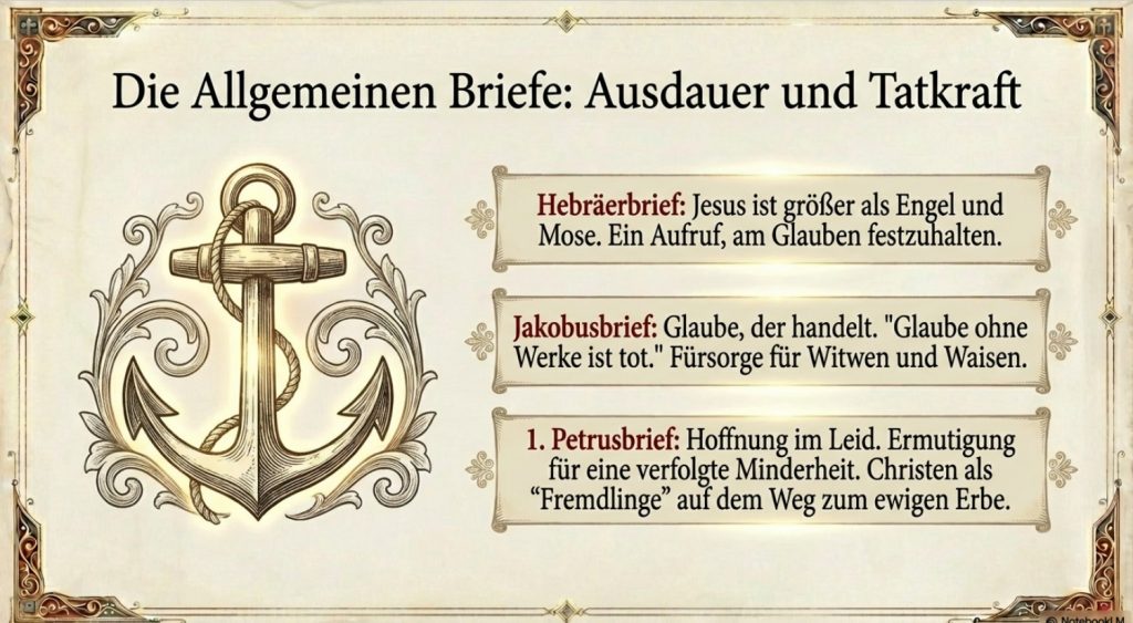 Hebräer (um 60–70 n. Chr.): Besserer Bund (Hebr 1–2). Hohepriester (Hebr 4–5). Neuer Bund (Hebr 8, Jer 31). Glaube (Hebr 11: Heldenhalle). Laufen mit Ausdauer (Hebr 12).Themen: Festhalten an Jesus. Verbindet AT und NT.