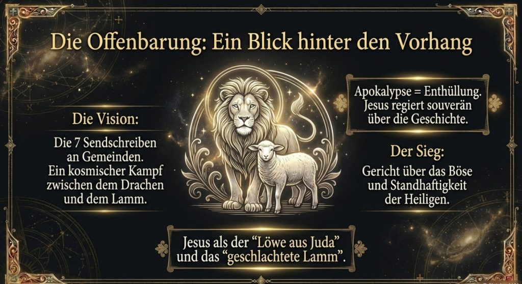 Das Buch der Offenbarung, auch Apokalypse des Johannes genannt, bildet den dramatischen Abschluss des Neuen Testaments und damit der gesamten Bibel. Es ist das einzige prophetische Buch im Kanon der neutestamentlichen Schriften und wurde um das Jahr 95 n. Chr. auf der Insel Patmos verfasst, wohin der Apostel Johannes, der Verfasser des Johannesevangeliums und der Johannesbriefe, von dem römischen Kaiser Domitian verbannt worden war. Die Offenbarung ist eine apokalyptische Literaturform, die durch visionäre Bilder, Symbole und dramatische Szenen gekennzeichnet ist – eine Art, die auch im Alten Testament in Büchern wie Daniel oder Hesekiel vorkommt. Ihr griechischer Titel „Apokalypsis“ bedeutet „Enthüllung“ oder „Offenbarung“, und sie enthüllt nicht nur zukünftige Ereignisse, sondern vor allem die Souveränität Gottes über die Geschichte und den endgültigen Sieg Jesu Christi über das Böse.