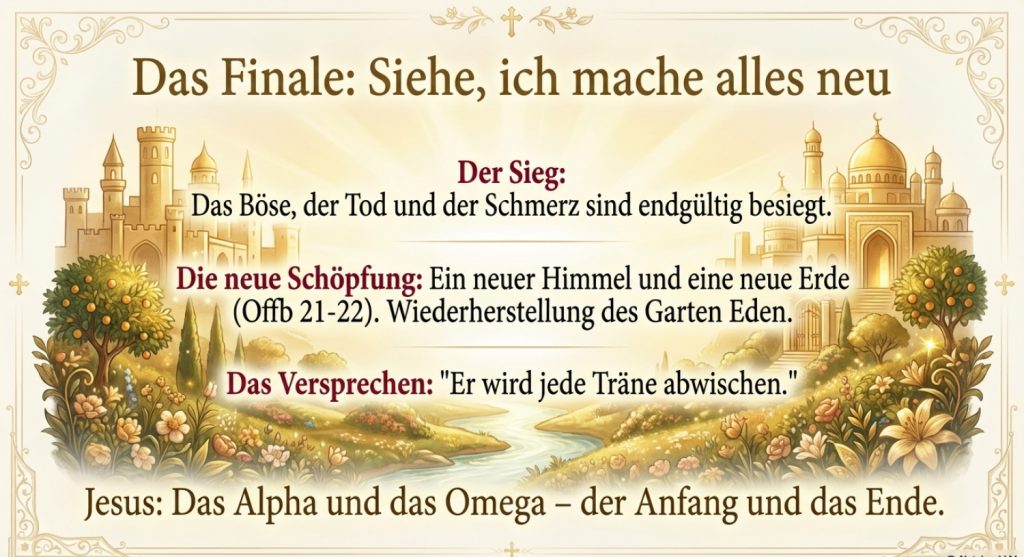 - Neuer Himmel und neue Erde (Offb 21–22): Erfüllung aller Verheißungen.