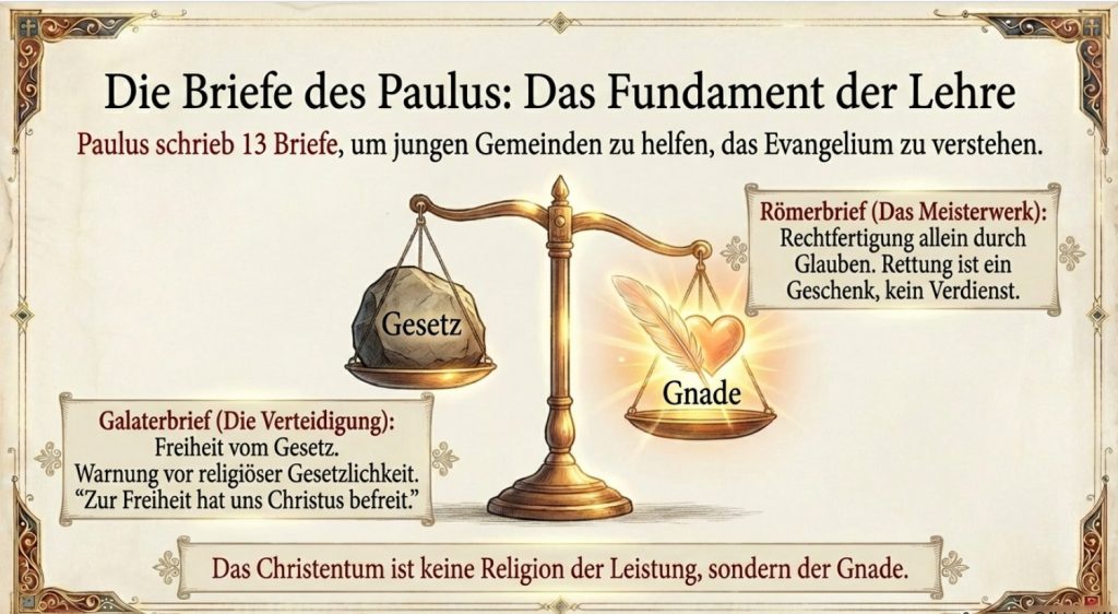 Galater (um 48–55 n. Chr.) polemisiert gegen Judaisten. Apostel des Evangeliums (Gal 1–2). Abraham-Segen (Gal 3): Glaube, nicht Werke. Erben durch Christus (Gal 4). Freiheit: Frucht des Geistes (Gal 5,22–23).